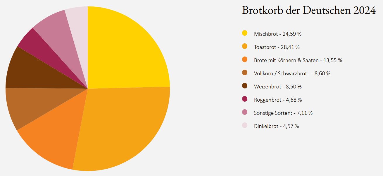 Die reichhaltige Auswahl an Backwaren ist ein Grund für den hohen Backwarenkonsum der Deutschen. Gegliedert nach ihren Mengenanteilen enthält der Brotkorb der Deutschen folgende Brotsorten: